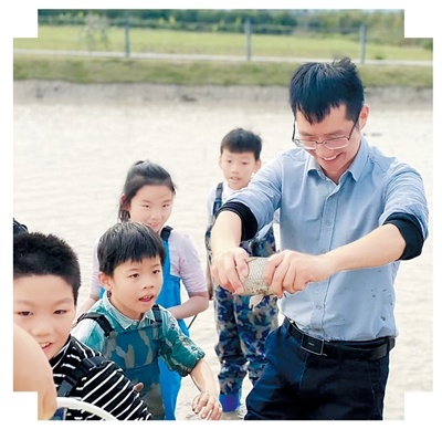 刘松带领小游客参加“浑水摸鱼”农文旅活动。王滨摄