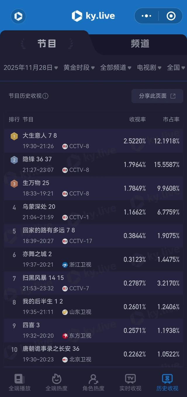 【收视黑马】最新收视榜单有点意思!本以为稳赢的《乌蒙深处》居然掉到第四,反倒是重播的《生万物》杀回前五破1%,而《隐锋》大结局1.7%的成绩直接给国产剧长脸了!最绝的是《大生意人》,虽然没破开播纪录,但稳坐冠军宝座——看来观众还是爱看这种"绝地反击"的剧本啊!